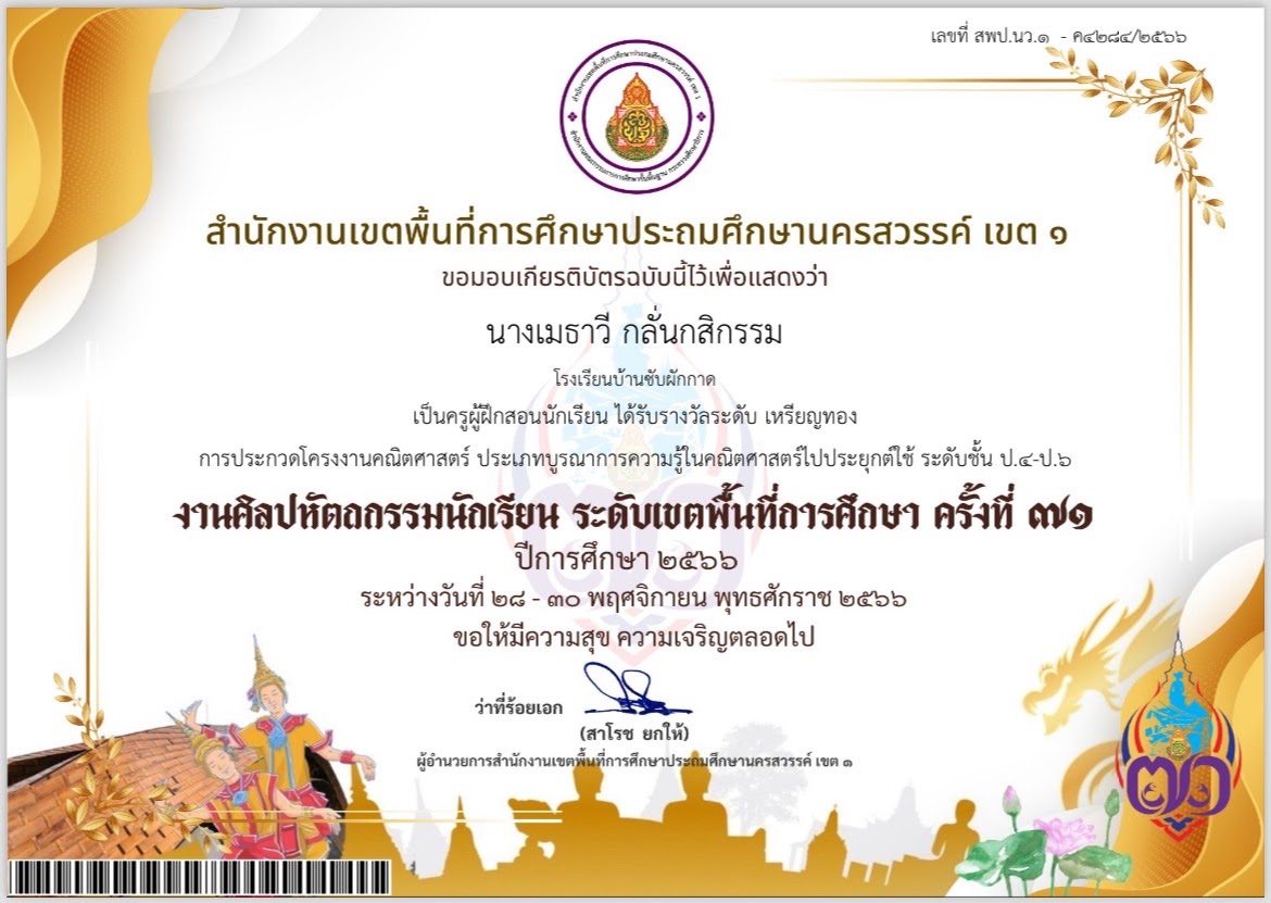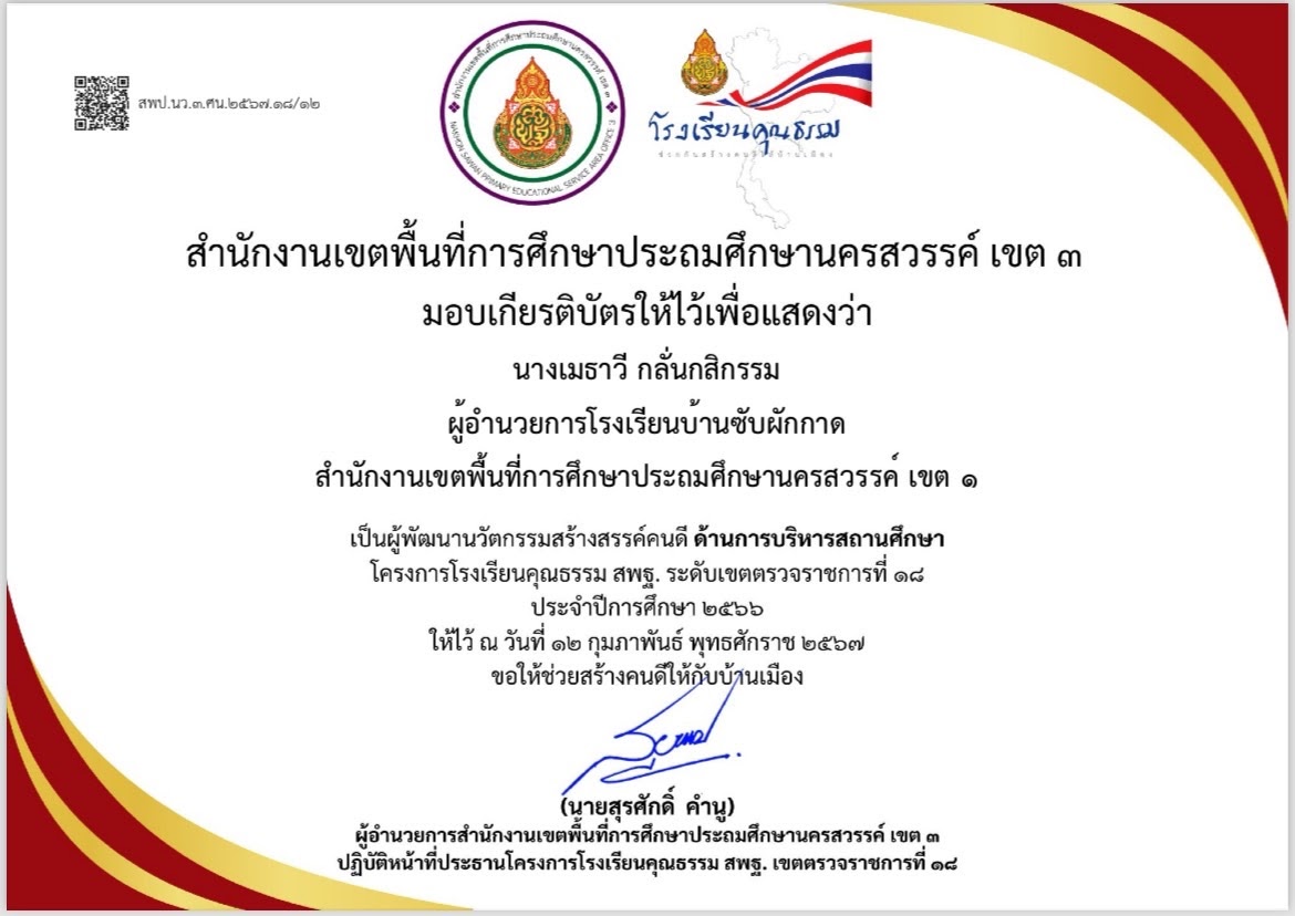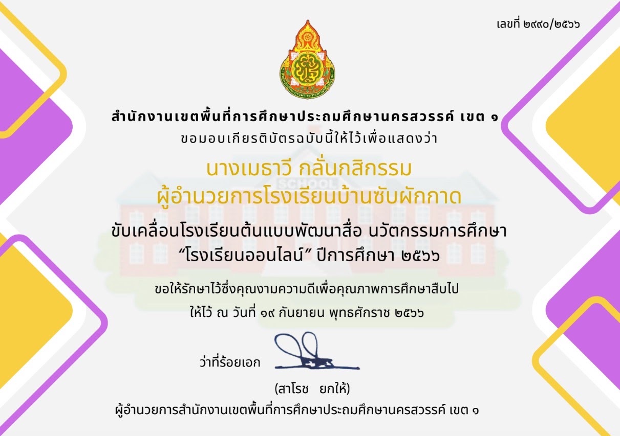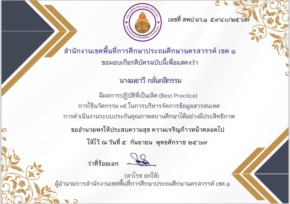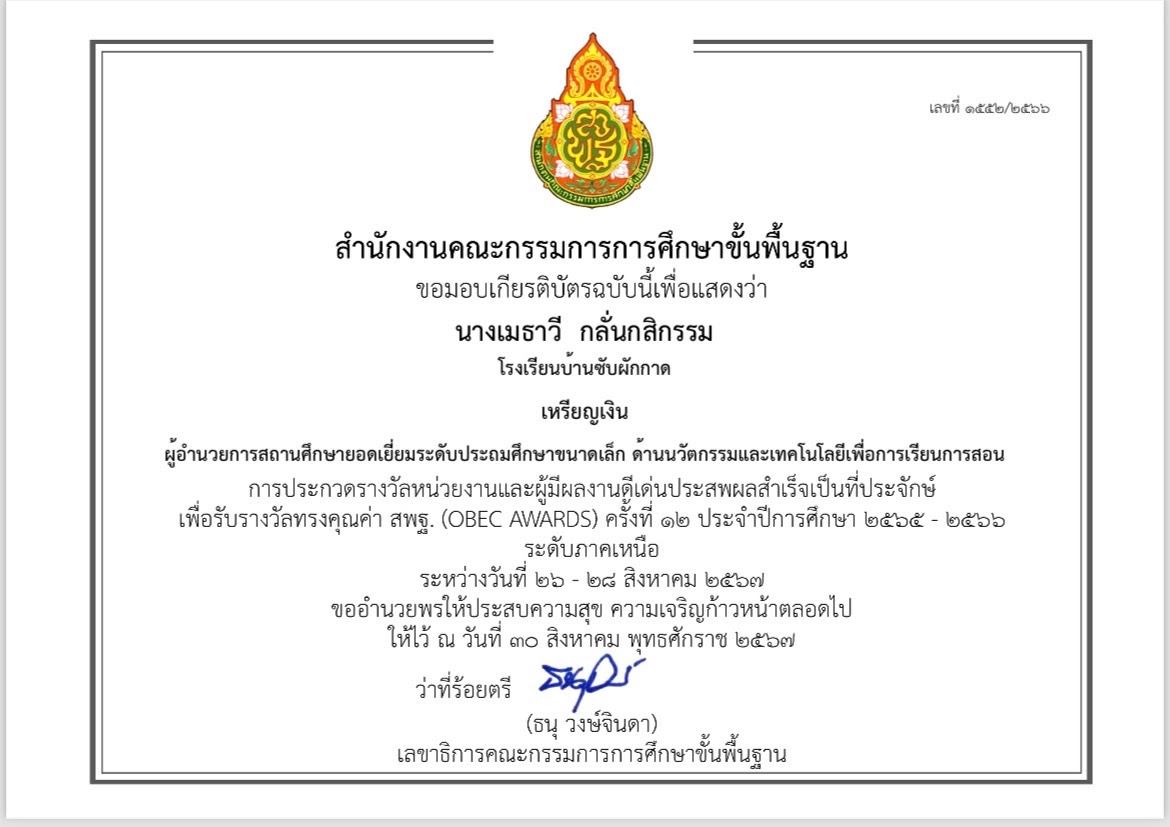 เกียรติบัตร ผู้อำนวยการสถานศึกษายอดเยี่ยมระดับประถมศึกษาขนาดเล็ก ด้านนวัตกรรมเพื่อการเรียนการสอน |